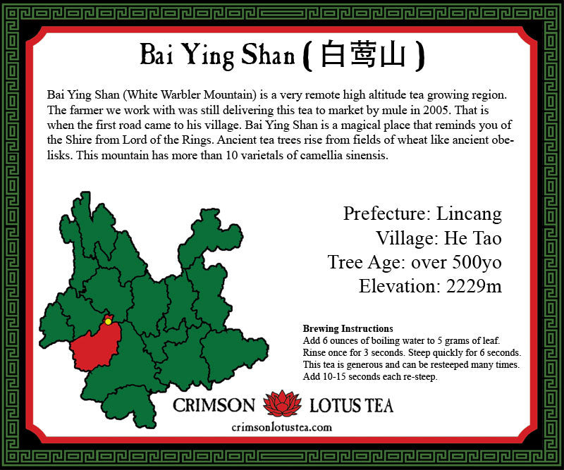 Bai Ying Shan (White Warbler Mountain, pronounced 'buying shah-n' ) is a very remote high altitude tea growing region. The farmer we work with was still delivering this tea to market by mule in 2005. That is when the first road came to his village. Bai Ying Shan is a magical place that reminds you of the Shire from Lord of the Rings. Ancient tea trees rise from fields of wheat like ancient obelisks. This mountain has more than 10 varietals of camellia sinensis.