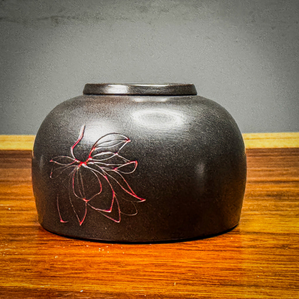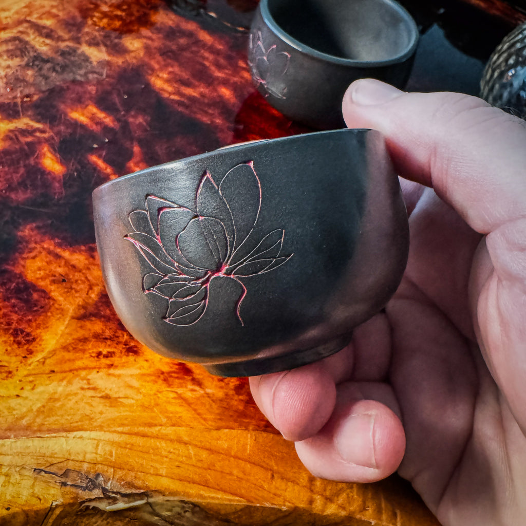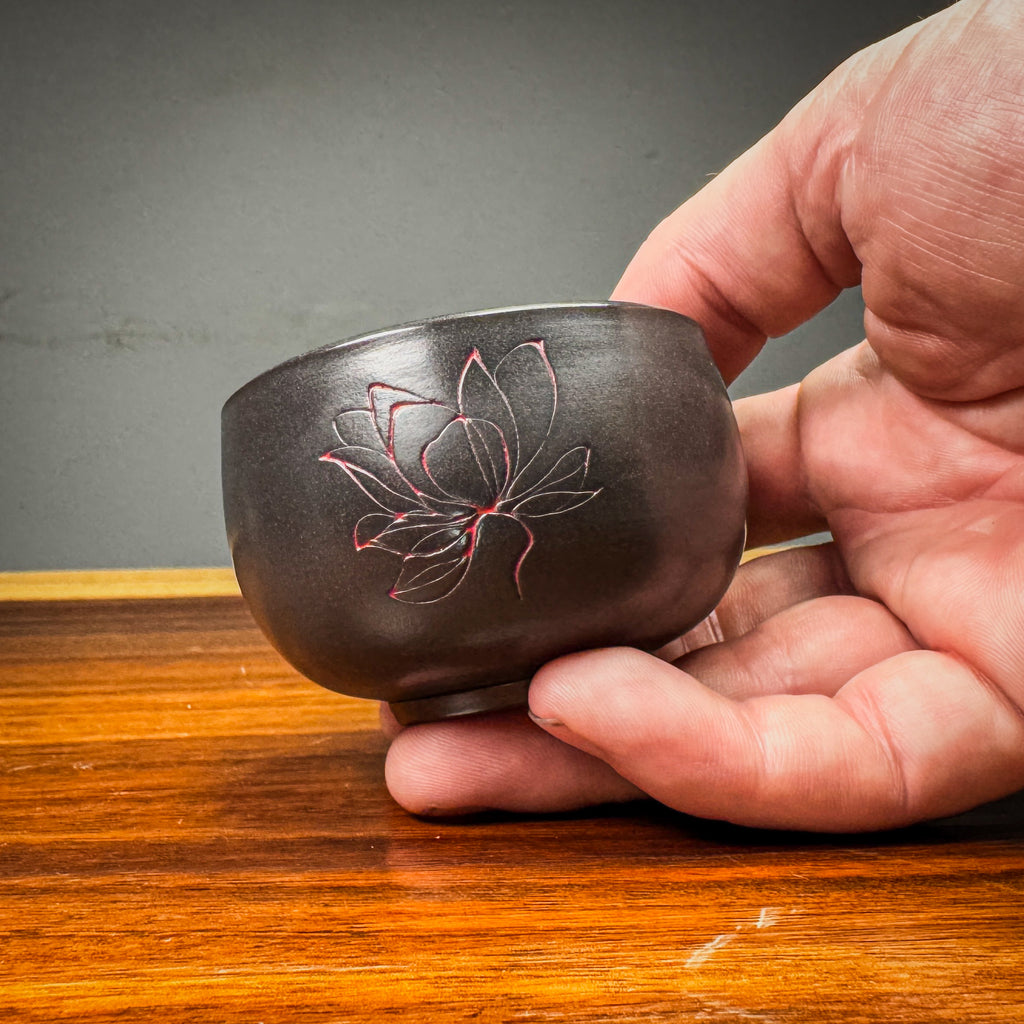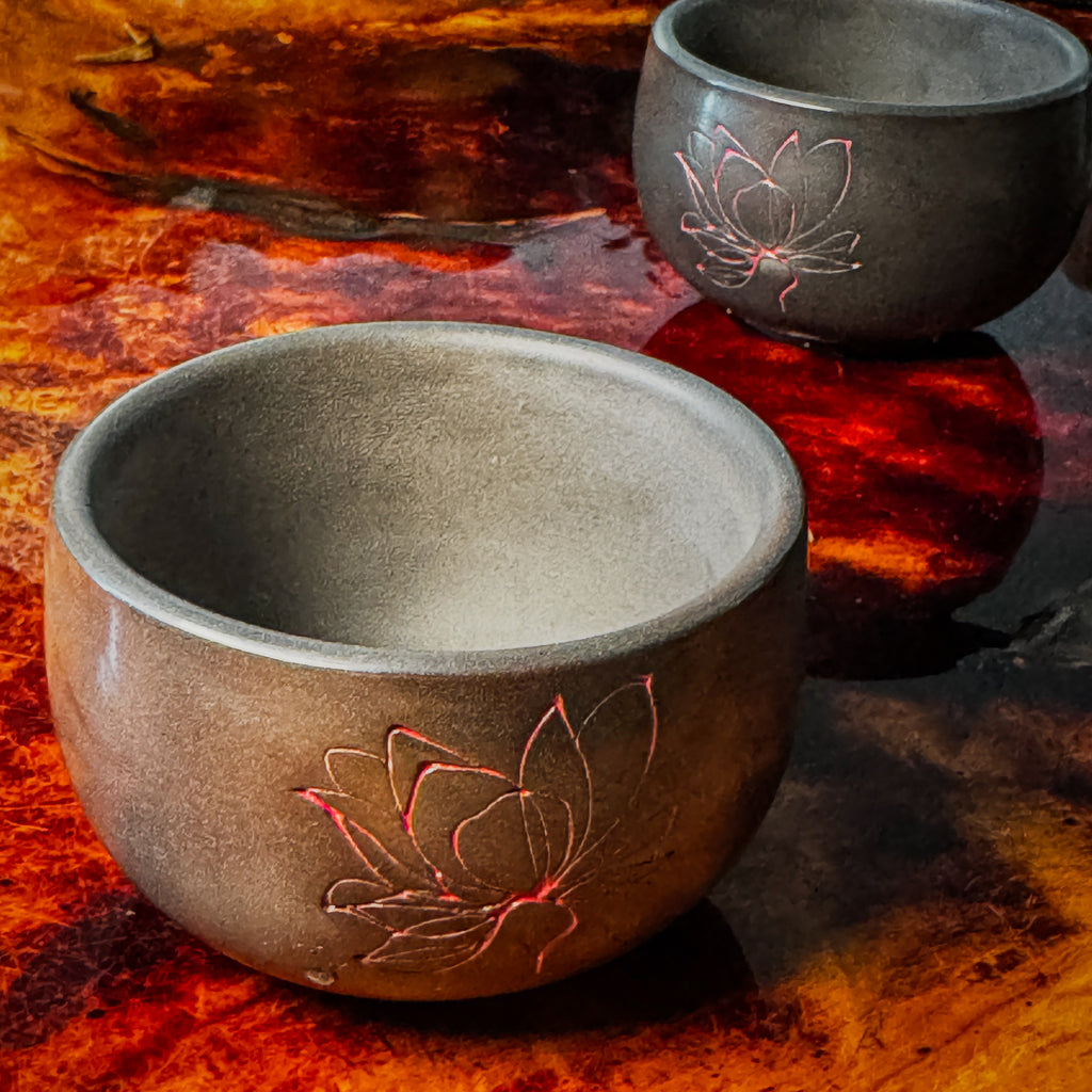 These cups were designed to match our Black Clay Lotus Gaiwans. These are really solid little cups. They have the same lotus design inlaid with a red glaze. The clay is the same aged Wanyao clay. These are really great little cups.