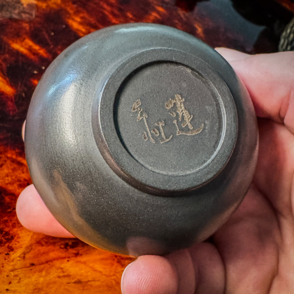 This teacup is polished black, Jianshui clay and are 80ml. They measure on average 6.5cm Wide x 4cm Tall.