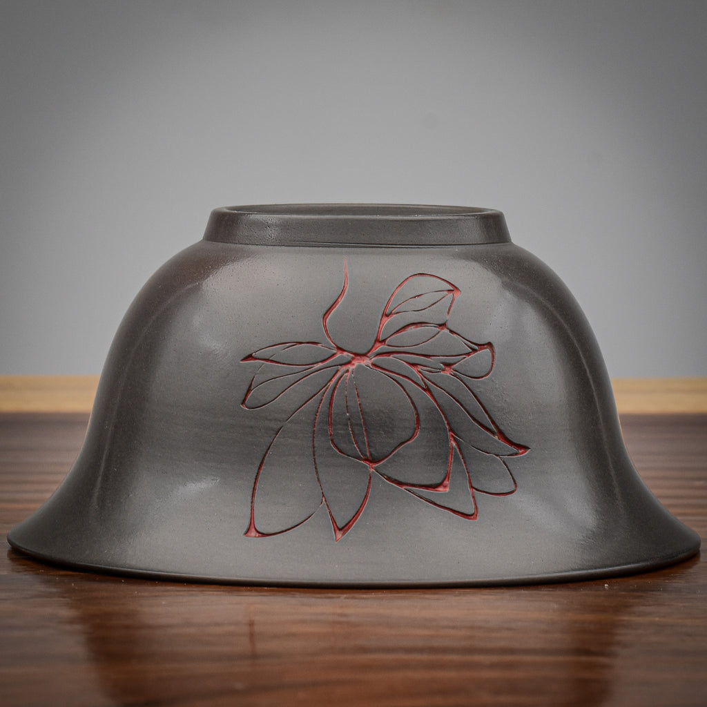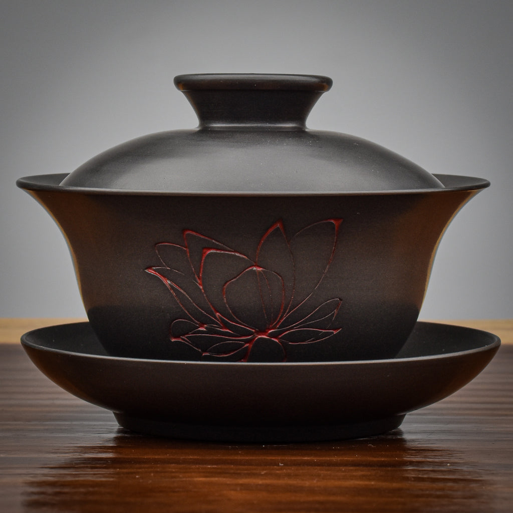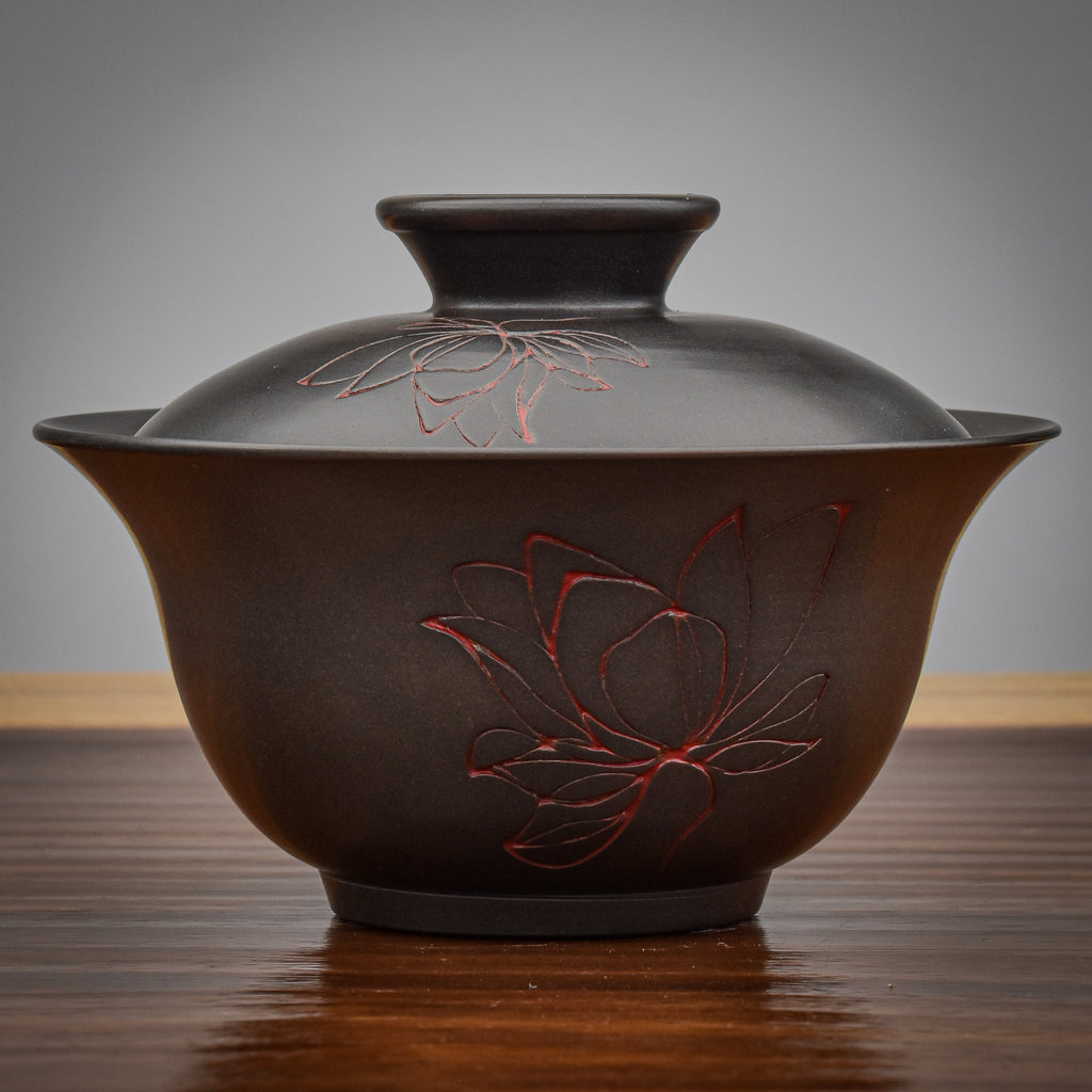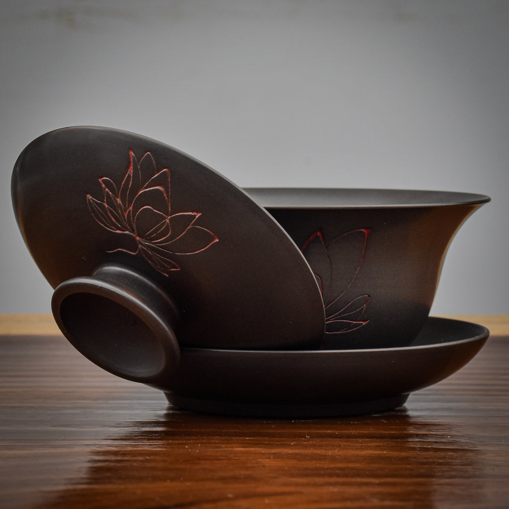 To set these gaiwans apart we had them carved with a lotus on the bowl and lid and inlaid them with red glaze.