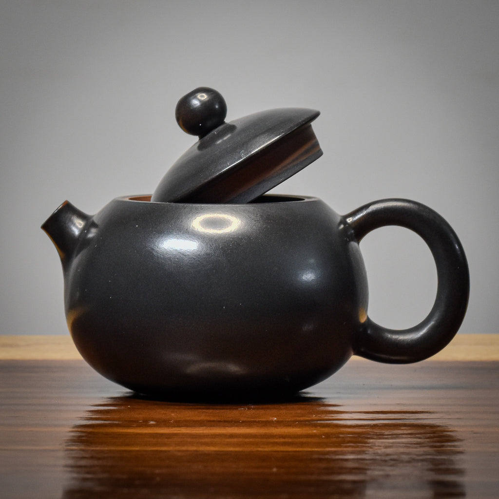 This teapot is polished black, Jianshui clay and is in the "Xishi" style. This teapot has a flat filter with 7 holes.