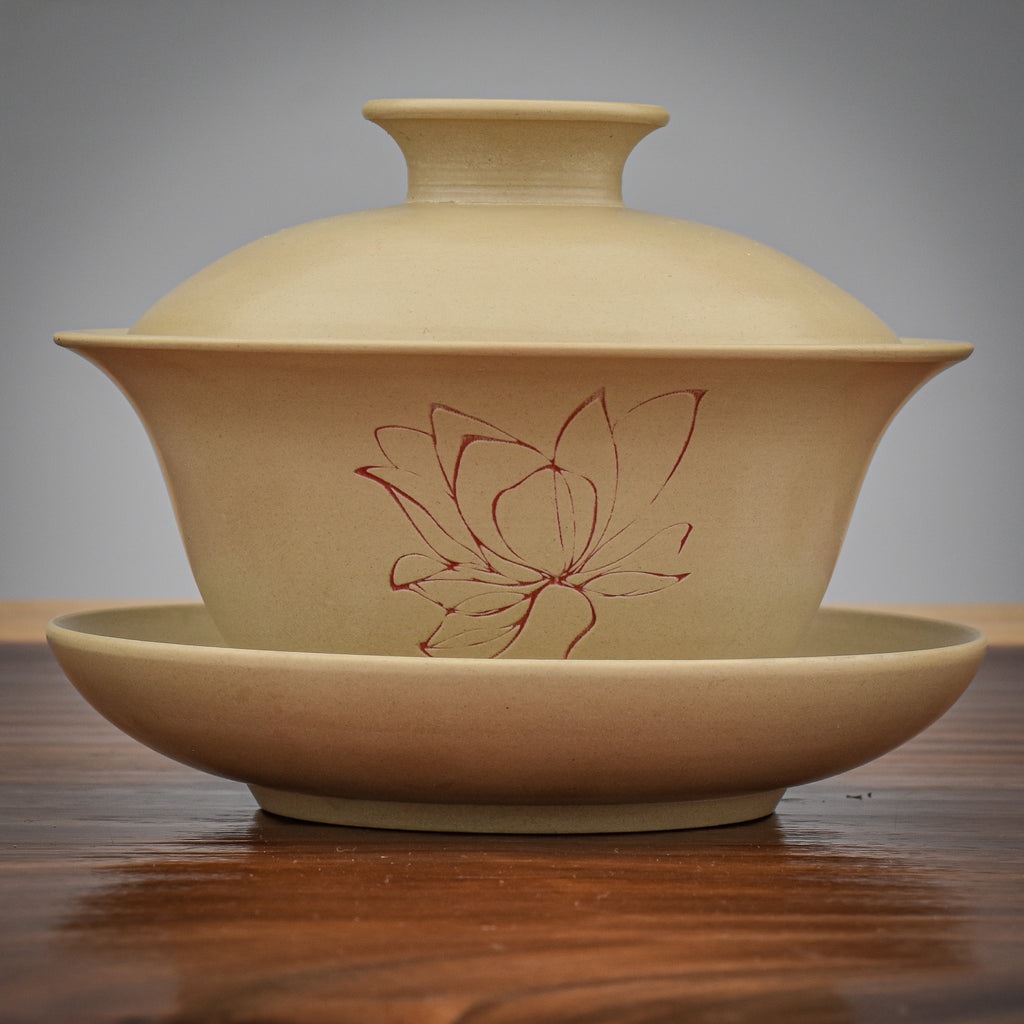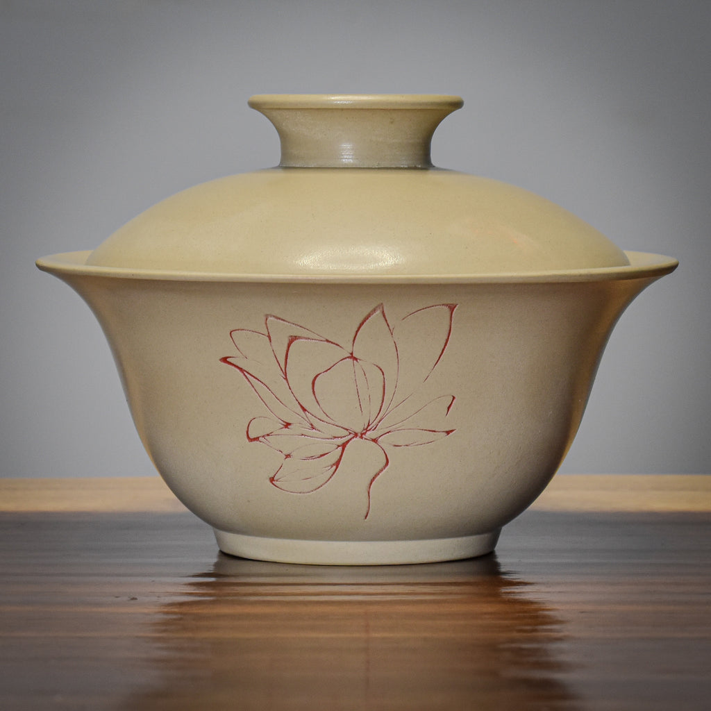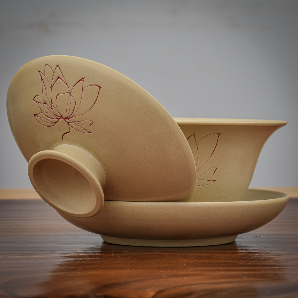 To set these gaiwans apart we had them carved with a lotus on the bowl and lid and inlaid them with red glaze.
