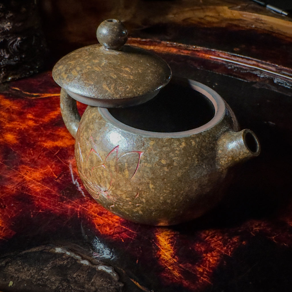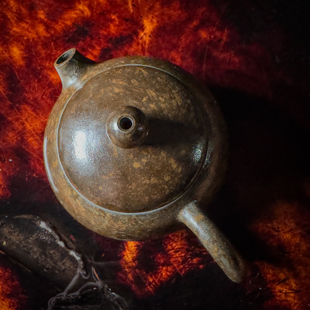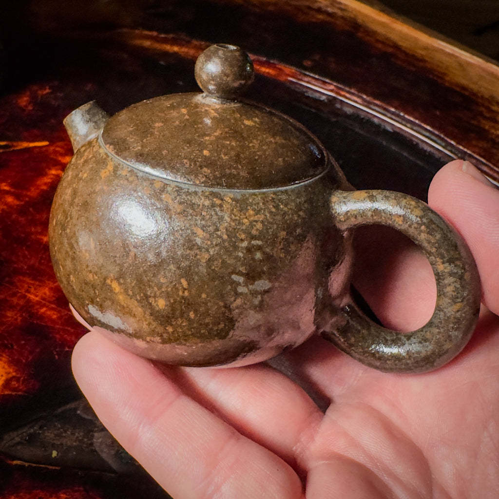 This teapot was wood fired in a kiln in Jianshui for 7 days. This teapot was fired in the same batch, same kiln, as our wood fired teacups. This teapot is thick walled and high fired. It pours fast and easy. It measures approximately 110ml in volume.