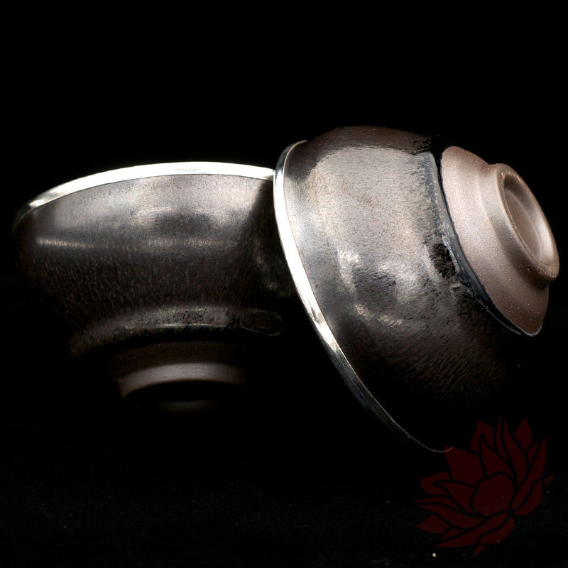 These cups have a thick dark glaze on them that has a sheen like an oil spill. These are solid cups. They have a heavy feel in the hand. These have been lined by hand with fine silver in Yunnan by local silversmiths. Drinking your tea in silver is a true pleasure. The silver reflects light and makes your tea vibrant in color; it almost glows. There is a noticeable difference in the taste as well.
