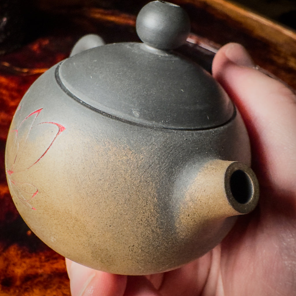 This teapot was wood fired in Jianshui. The unique pattern is created by the shifting flame and smoke in the kiln. This teapot is thick walled and high fired. It pours fast and easy. It measures approximately 100ml in volume.