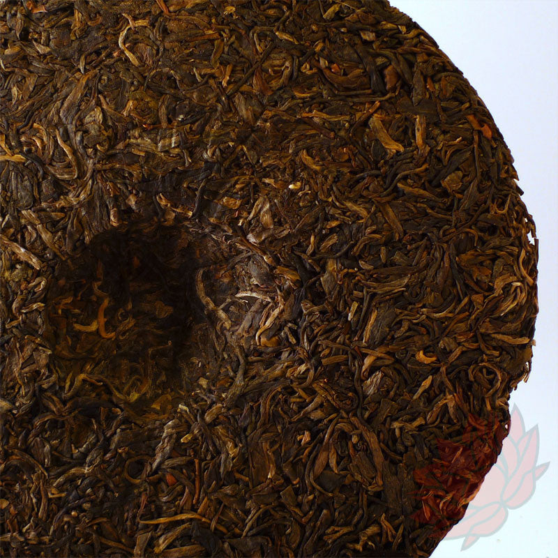 This 'Qiaomu' (Arbor Tree) sheng puerh brews with a golden liquor and pleasing aroma. The brew is very smooth with a thick mouthfeel that brings a wisp of smokiness. The aftertaste arrives with a hint of guava and a sweetness reminiscent of Smarties candy.