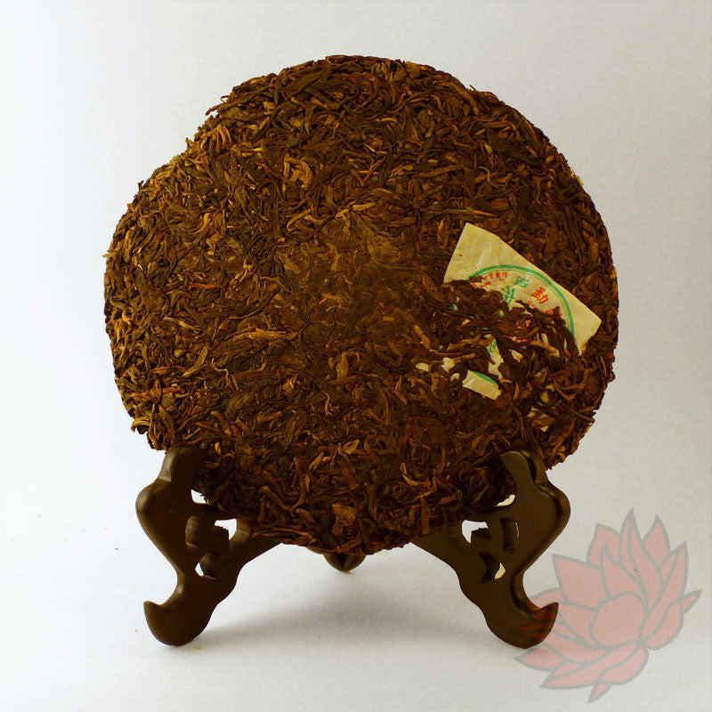 This is a dry stored, stone pressed, sheng puerh from Bulang with just a hint of age to it. The Bulang Mountains are a high altitude puerh tea growing region in Xishuangbanna, Yunnan, China, where dense green jungles meet clear blue skies.