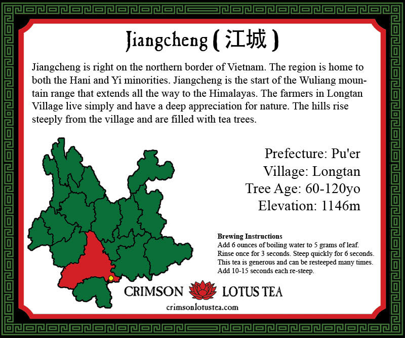 Jiangcheng ( pronounced 'jong chung' ) is right on the northern border of Vietnam. The region is home to both the Hani and Yi minorities. Jiangcheng is the start of the Wuliang mountain range that extends all the way to the Himalayas. The farmers in Longtan Village live simply and have a deep appreciation for nature. The hills rise steeply from the village and are filled with tea trees.