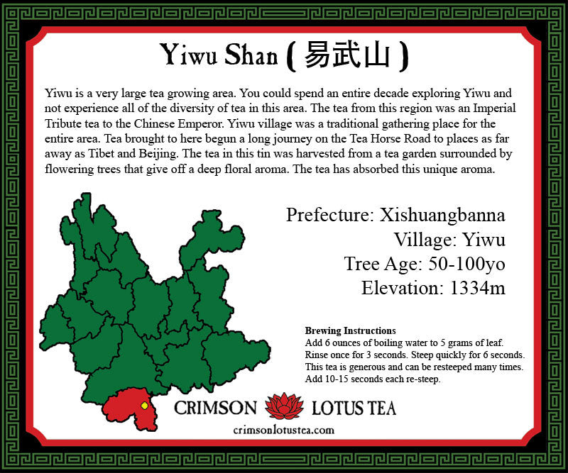 Yiwu ( pronounced 'E-Woo' ) is a very large tea growing area. You could spend an entire decade exploring Yiwu and not experience all of the diversity of tea in this area. The tea from this region was an Imperial Tribute tea to the Chinese Emperor. Yiwu village was a traditional gathering place for the entire area. Tea brought to here begun a long journey on the Tea Horse Road to places as far away as Tibet and Beijing. The tea in this tin was harvested from a tea garden surrounded by flowering trees that give off a deep floral aroma. The tea has absorbed this unique aroma.